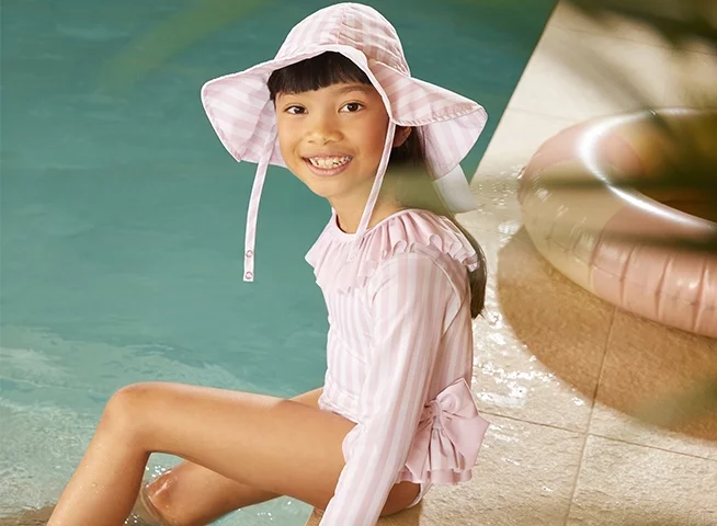 First on the checklist is a pair of sunglasses or swim goggles, like these from Molo and Bling2o. Not only will they add some fun to their beachside look, but they are also inbuilt with lenses that offer maximum UVA and UVB protection. Next up is a sun hat — we recommend looking for styles with wide brims, and for extra coverage, a legionnaire's hat will protect the back of their neck from the sun. In their bag, you’ll also need a beach towel, plenty of water and snacks, and a few beach toys. Now, who can make the biggest sandcastle?