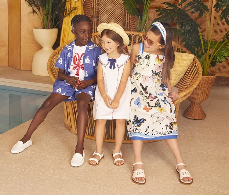 We love Mini Rodini’s cotton shirt-and-shorts co-ord, printed all over with sweet sailboats. It’s made in lightweight cotton that'll keep them cool on a hot day, and there are lots of matching pieces too, which are great for siblings who love to coordinate — cue the photo opportunities! For her, this gorgeous Dolce & Gabbana butterfly sundress will be the star of her summer outfits, complete with a matching swimsuit and sunglasses to take her look from the pool to the piazza in style.