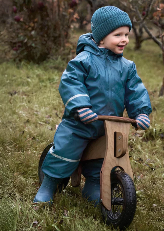 If your little explorers tend to make a beeline for the closest puddle, then this practical waterproof set from CeLaVi will fast become their go-to when the heavens open. From head to toe, they'll be happy and dry thanks to the hooded jacket and coordinating salopettes-style trousers, designed in this rich shade of blue — and it also comes in pink too! On the technical side of things, this design ticks every box: welded seams, adjustable Velcro cuffs, and a storm flap keep the wind and rain out where it belongs, reflective trims improve visibility, and elasticated stirrups on the trousers keep them securely tucked into their rain boots, so no leaks!