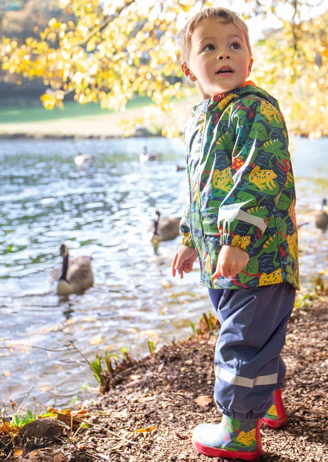 From teddy bears to colourful frogs, this brilliant boys' raincoat is perfect for exploring the outdoors on a soggy day. Just like our amphibian friends, Frugi's fun jacket is designed to withstand wet weather conditions. The watertight welded seams leave no open stitches for water to permeate the fabric, meaning he'll stay dry, even on the rainiest of days, and the addition of pocket and storm flaps help to prevent water from creeping in. And the colourful camouflage-effect print and reflective trims will make him easy to spot.
