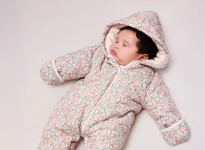 Your little one will have different needs, depending on whether you're heading to the slopes or for a wintry stroll in the park. For the coldest outings, look for heavier-weight designs with weatherproof fabric on the outside and down padding on the inside, and fully covered feet. For those everyday outings, opt for a less bulky design with a breathable cotton outer and without boots or mittens.