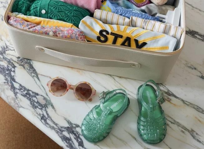 Jelly shoes are a must for us. My daughter loves them and these Mini Melissa ones have added sparkle. They're anti-slip for around the pool area so they’re definitely a must. A few sets of swimwear are essential — my son really liked these Vilebrequin trunks. Another thing I think is really useful is a night light. I always take one to hotels to give the kids some ease if it's too dark.