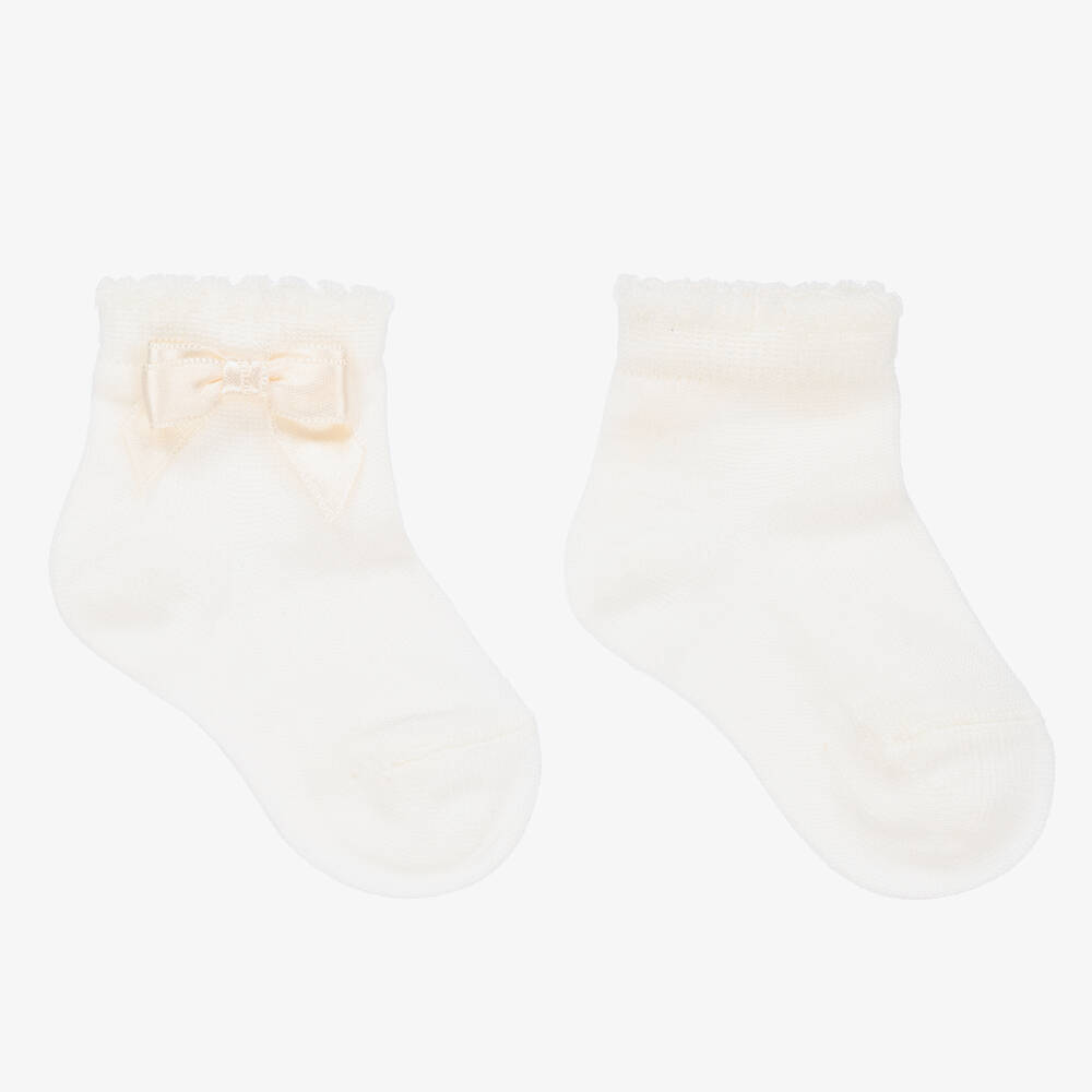 Baby girls ivory socks by Story Loris. Finely knitted in soft cotton, these cute scallop-edged socks are decorated with a silky bow.