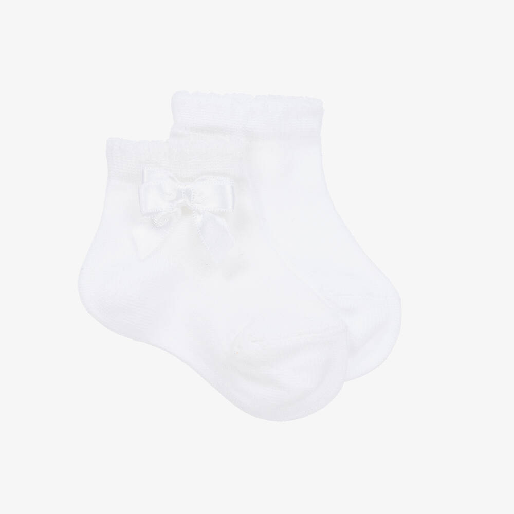 Baby girls pale pink socks by Story Loris. Finely knitted in soft cotton, these cute scallop-edged socks are decorated with a silky bow.