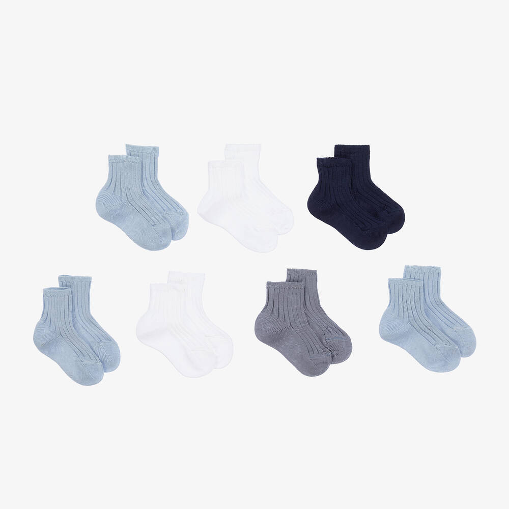 Seven pairs of socks for baby boys and girls by Story Loris. Made in a soft, fine cotton knit, they feature white and a gradient of blue shades, with comfortable elasticated ankle cuffs. Presented in a box, they would be an ideal gift for new parents.