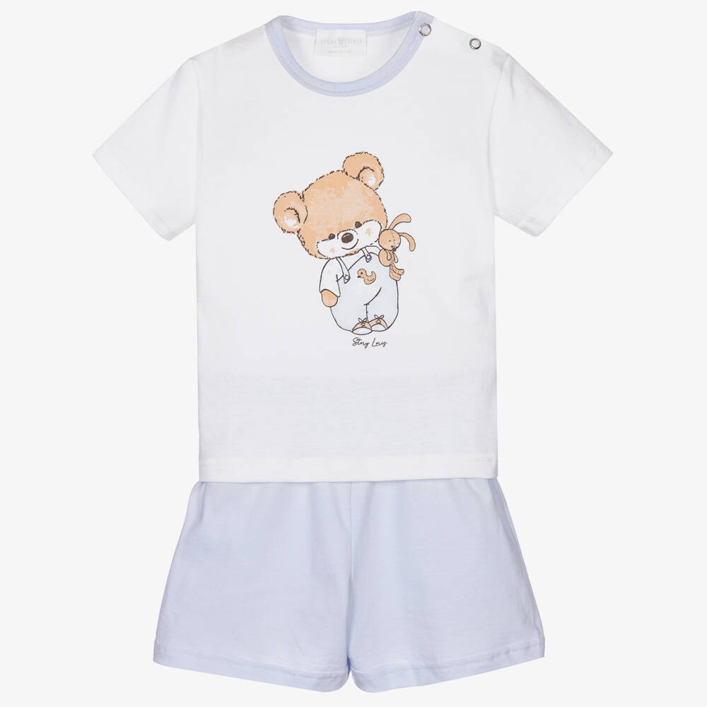 White and pale blue short pyjamas for little girls and boys by Story Loris, made in soft cotton jersey. The top has a sweet brown teddy and bunny motif on the front, with easy-fastening poppers on one shoulder.