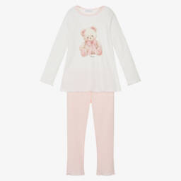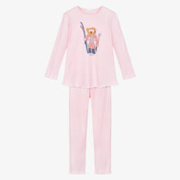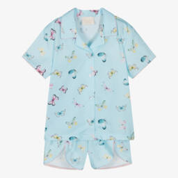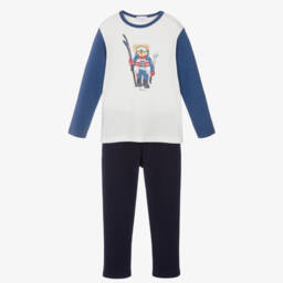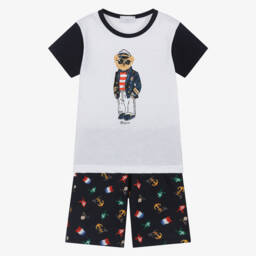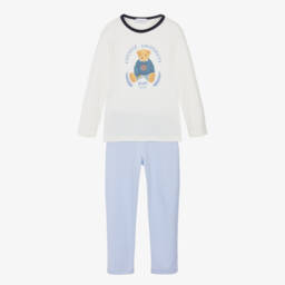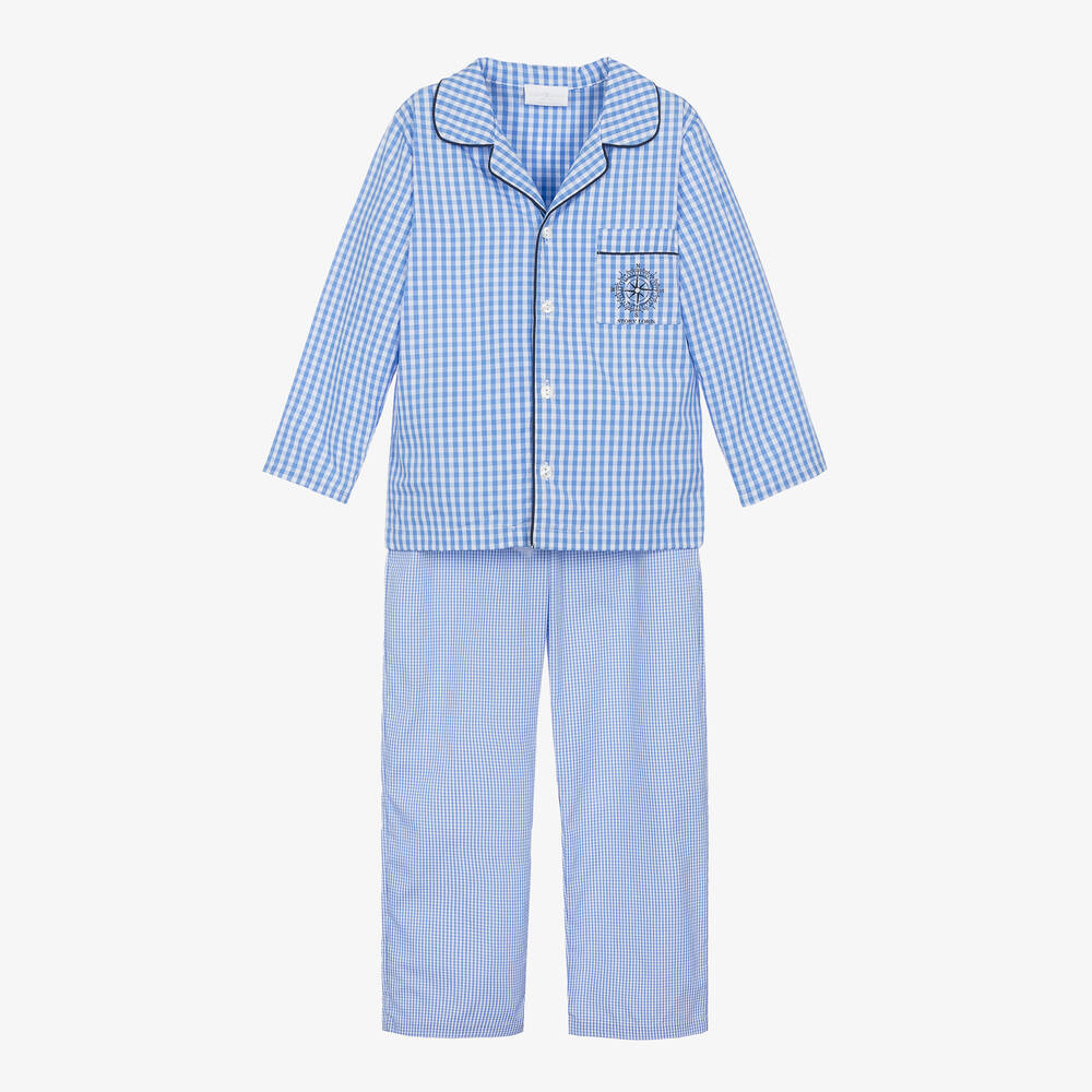 Blue and white gingham check pyjamas for boys by Story Loris, made in lightweight cotton. The top has a compass logo motif on the chest pocket, navy blue piped trims and front button fastenings. In a smaller check, the trousers have a comfortable elasticated waistband.