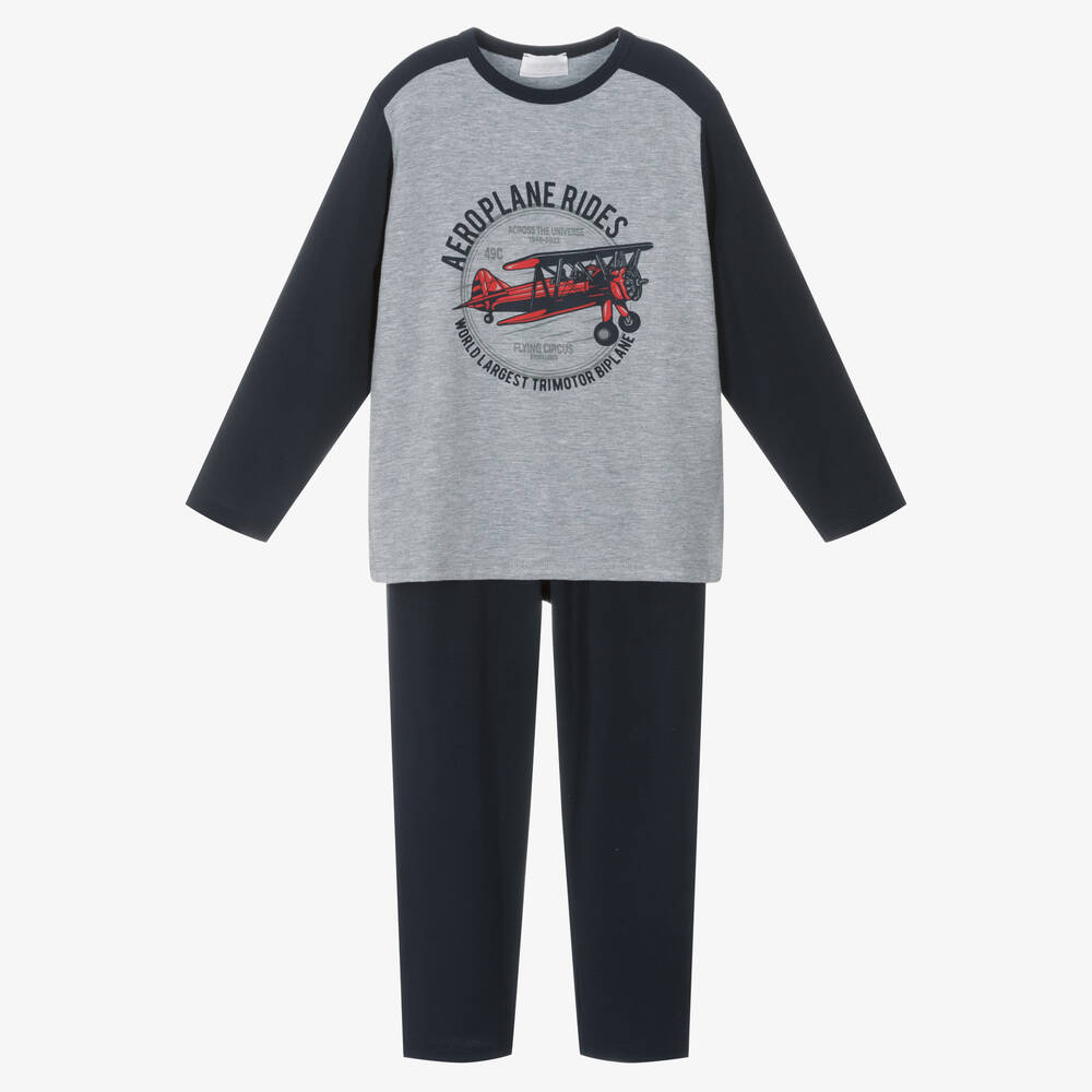 Super soft grey and navy blue micromodal pyjamas for boys by Italian designer Story Loris, made in comfortable, stretchy jersey. The grey marl top has a red and navy blue vintage aeroplane printed on the front and contrasting navy blue sleeves. The matching trousers have a gently elasticated waistband for a good fit.