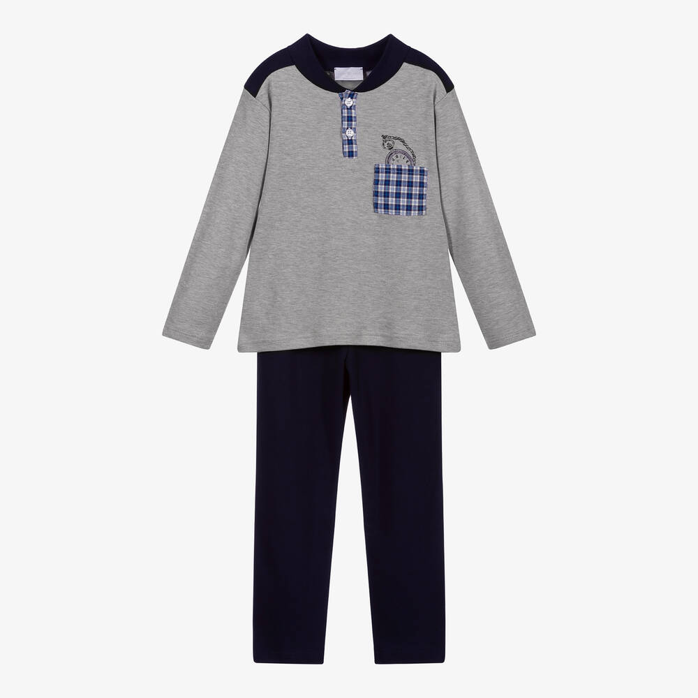 Boys grey and navy blue pyjamas by Story Loris, made in soft cotton jersey. A pocket watch motif is partially concealed behind the contrast plaid check chest pocket, with a matching button fastening placket on the neckline and a navy blue collar. The coordinating trousers have a comfortable elasticated waistband.
