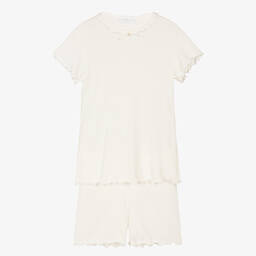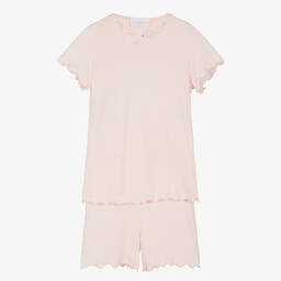 Pale pink short pyjamas for girls by Story Loris. Made with luxuriously soft, ribbed modal jersey, both pieces have pretty fluted edges. The short-sleeved top has a lace-trimmed neckline and a diamanté with a silky bow appliqué. The shorts have a comfortable elasticated waist. Presented in a box, they would make a lovely gift.