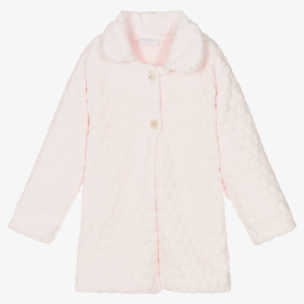 Cosy and comfortable, pale pink dressing gown for girls by Italian designer Story Loris. Made in luxuriously soft plush fleece, it has a delicate raised dotted pattern and a classic rounded collar. The body is lined in cotton jersey for breathability, and there are pearlised buttons to secure down the front.