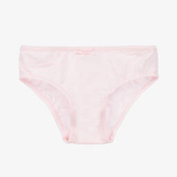 Soft and comfortable, pale pink cotton knickers for girls by Story Loris. They are made in stretchy jersey, trimmed with a pretty ribbon bow on the front.