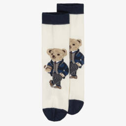 Dark green cotton-rich socks for boys and girls by Story Loris, featuring a charming teddy bear motif. Soft and stretchy, they have contrasting navy blue trims and branded soles.