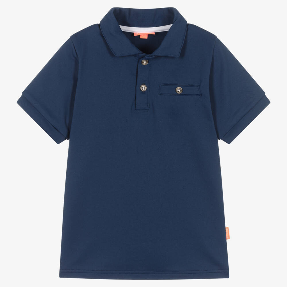 Navy blue polo shirt for boys by British swimwear brand Sunuva. Made in stretchy, sun protective piqué, it is ideal for wearing by the beach or pool. On the front it has button fastenings and a faux pocket, with a neon orange logo tab on one side seam.