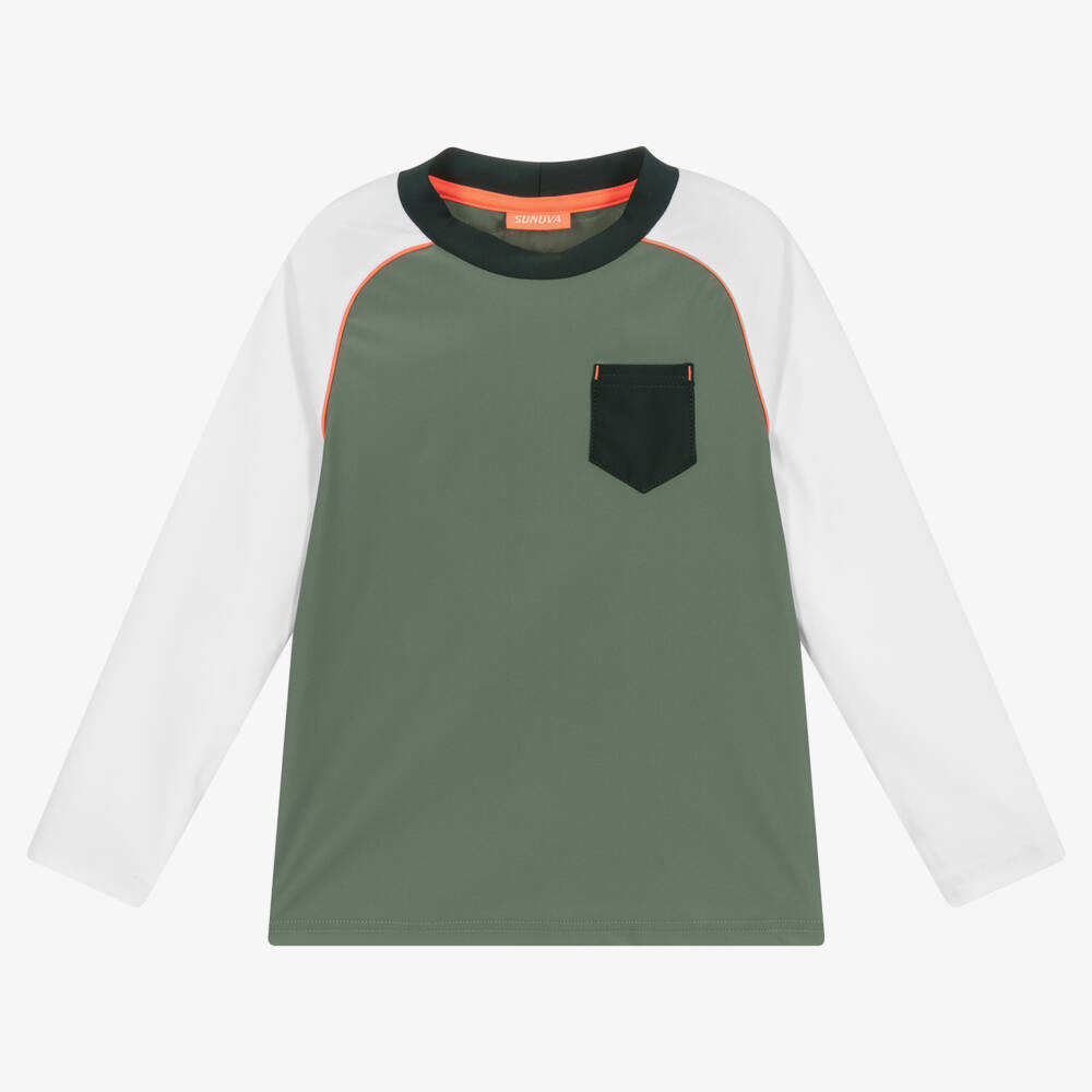 Khaki green and white swim top for boys by British swimwear brand Sunuva, just right for days by the beach or poolside. Made in recycled, silky sun protective jersey, it has a contrasting green patch pocket on the front with a matching neckline and neon orange trims. The brand's neon orange logo tab is sewn on one side seam.