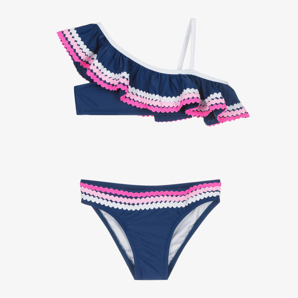 Navy blue bikini for girls by swimwear brand Sunuva, with ric rac trims in pink and white for a vibrant poolside look. Made from silky, stretchy recycled fabric, both pieces are fully lined to ensure maximum comfort. The asymmetric top has a lovely ruffle around the body and over one shoulder, with a narrow strap on the other side.