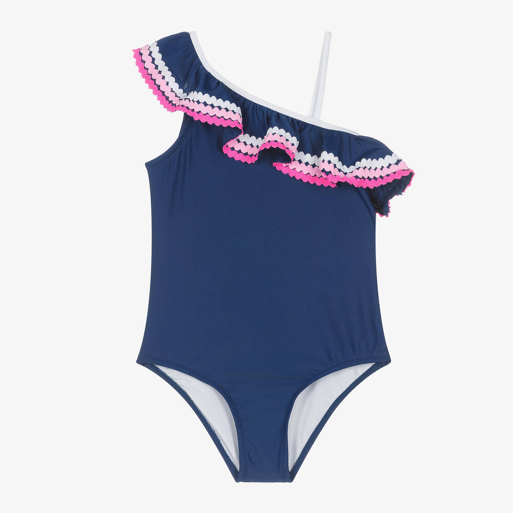 Stylish asymmetric navy blue swimsuit for girls by swimwear brand Sunuva, with eye-catching ric rac trim in pink and white. It is made in silky, stretchy recycled fabric with a soft lining for maximum comfort. There is a narrow shoulder strap on one side and a lovely ruffle around the body and over one shoulder for a sophisticated poolside look.