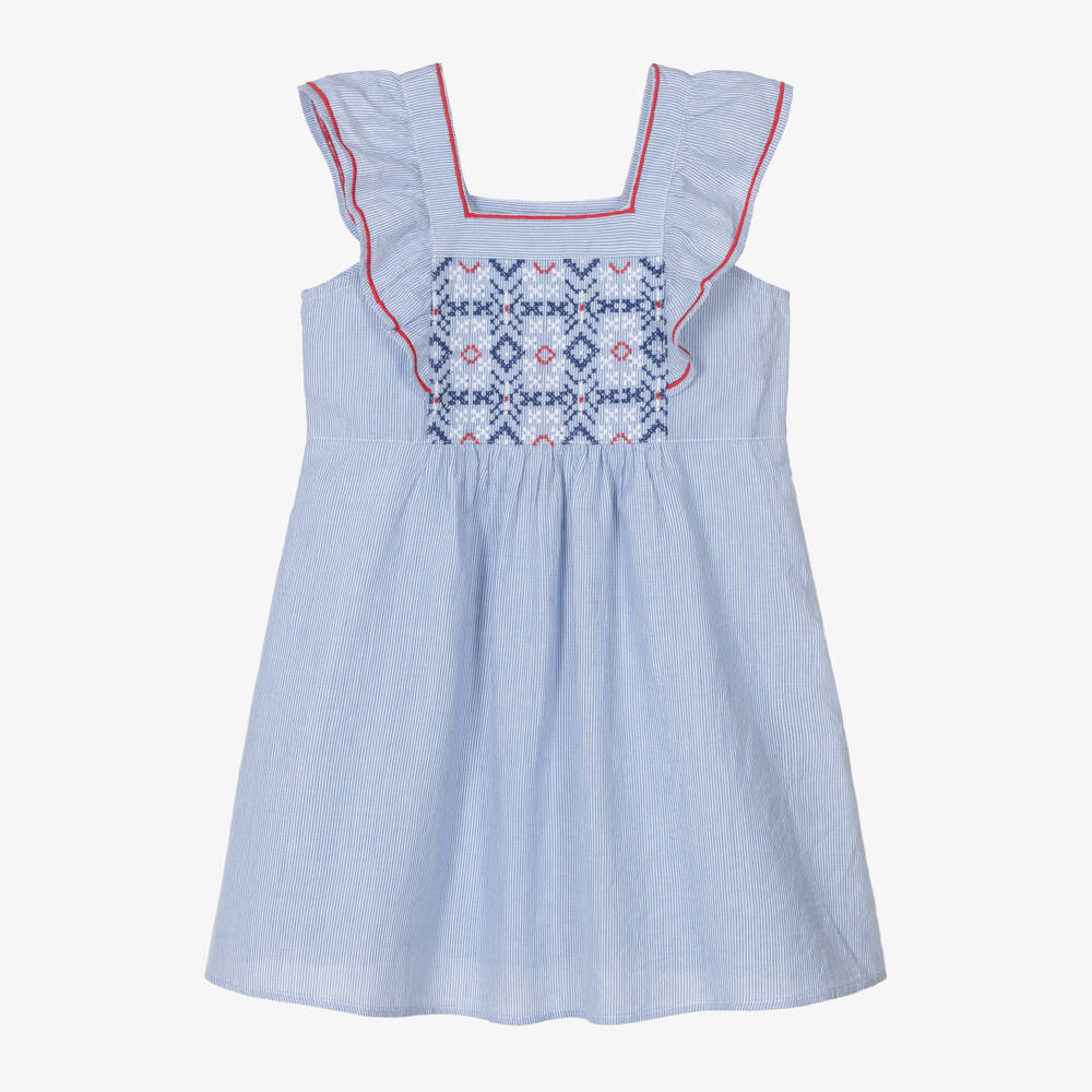 Lovely cotton sleeveless dress for girls by Sunuva, in fine blue and white stripes. Softly woven and lightweight, it is ideal for warm days or as a cover-up at the beach, pool or resort. Simply styled with a square neckline and ruffles on the bodice, this easy slip-on style has a pretty embroidered pattern on the front in red, white and blue, and red trim.