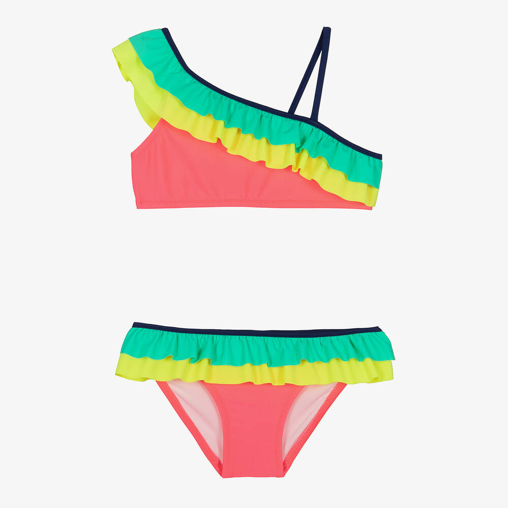 A vibrant neon pink bikini for girls by swimwear brand Sunuva, made from silky smooth and stretchy recycled fabric. Detailed with bright green and yellow ruffles, the bikini top has both wide and narrow shoulder straps for an asymmetric look. The matching bottoms have a navy blue trim on the elasticated waist for an extra pop of colour. Both pieces are fully lined to ensure maximum comfort.