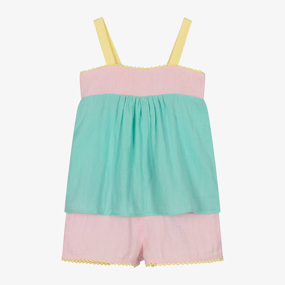Sweet and pretty, this pastel pink and green colourblock shorts set for girls is by Sunuva. Made from soft and lightweight cotton, both pieces have sweet yellow zig zag trims for a delightful finish. Complete with narrow yellow straps, the flowy top has a shirred panel on the back and the coordinating shorts have an elasticated waist to ensure a comfortable fit.