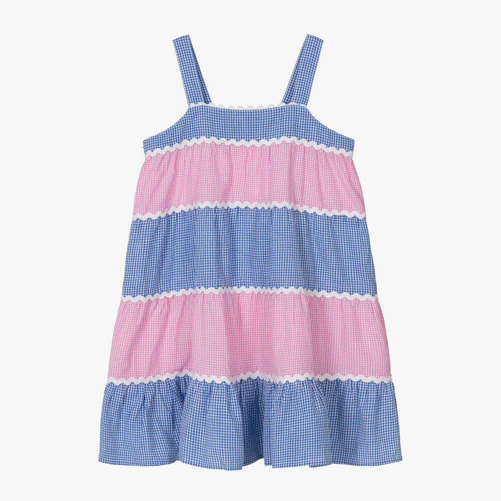 A lovely pink and blue dress for girls by Sunuva, made in a soft cotton composition for a cool and lightweight feel. Floaty and fun, this simple style is designed with a square neckline and narrow shoulder straps. It has a timeless gingham pattern and off-white ric rac trims that create multiple tiers.