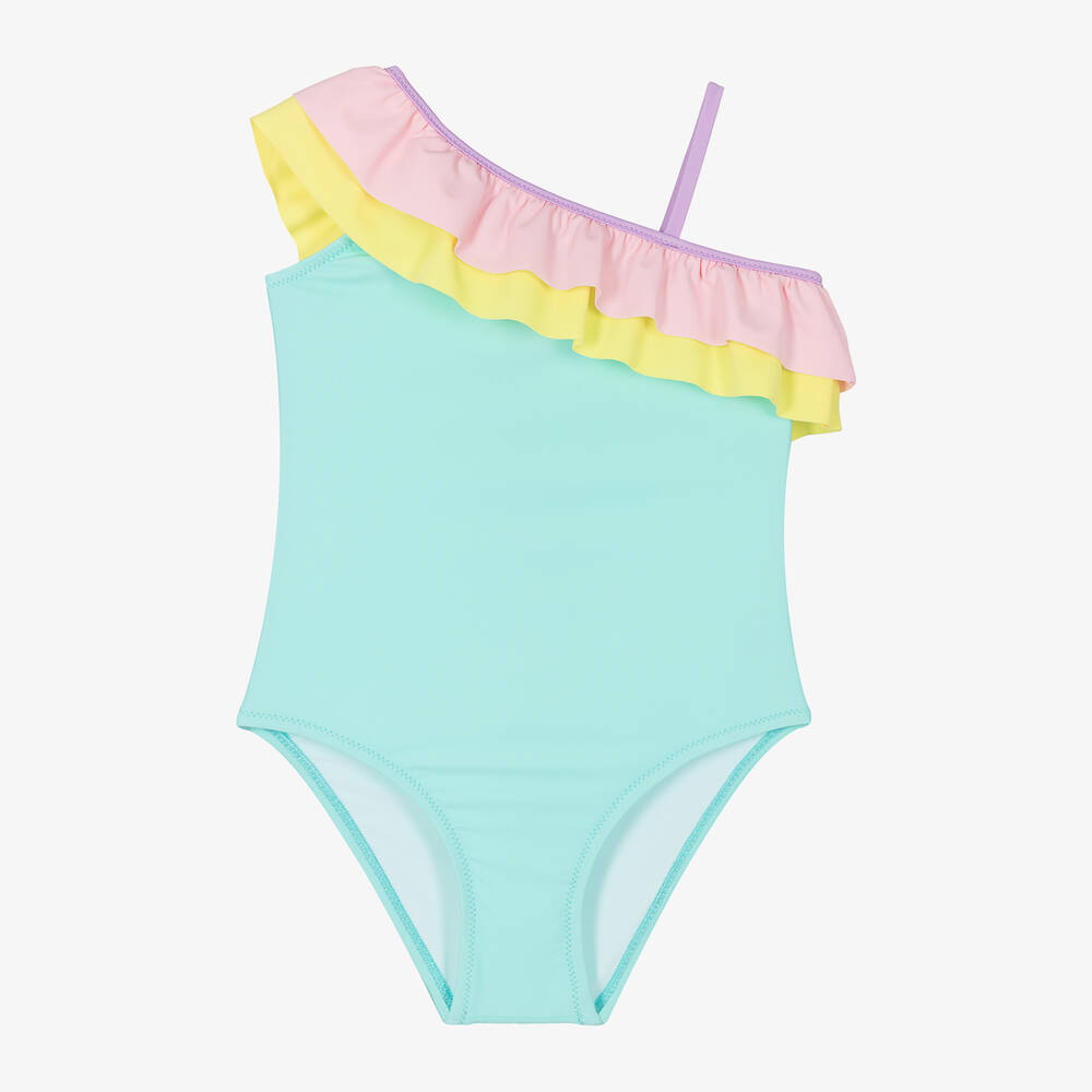 Turquoise blue swimsuit for girls by British brand Sunuva, made in silky smooth recycled fabric with a lightweight lining. For days spent at the pool or beach, this pretty all-in-one has an asymmetric silhouette with a lilac purple strap on one shoulder. In shades of pink and yellow, the colourblock ruffles add a vibrant touch of colour.