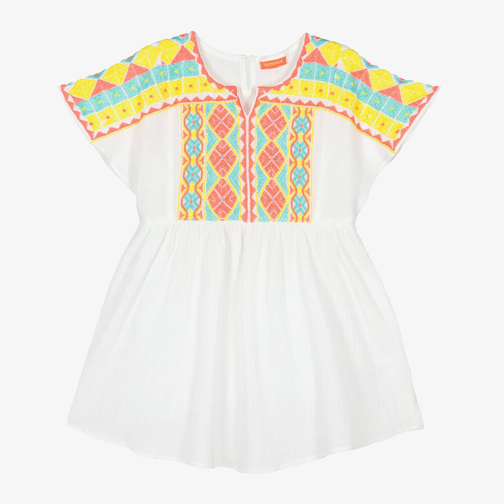A pretty white beach dress for girls by swimwear brand Sunuva, made from lightweight cotton cheesecloth. Beautifully paired alongside their poolside look, it has a slit in the neckline with colourful neon embroidery for a vibrant look. The sleeves are styled in a relaxed dropped fit and a keyhole button fastens neatly on smaller sizes.