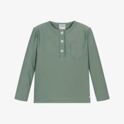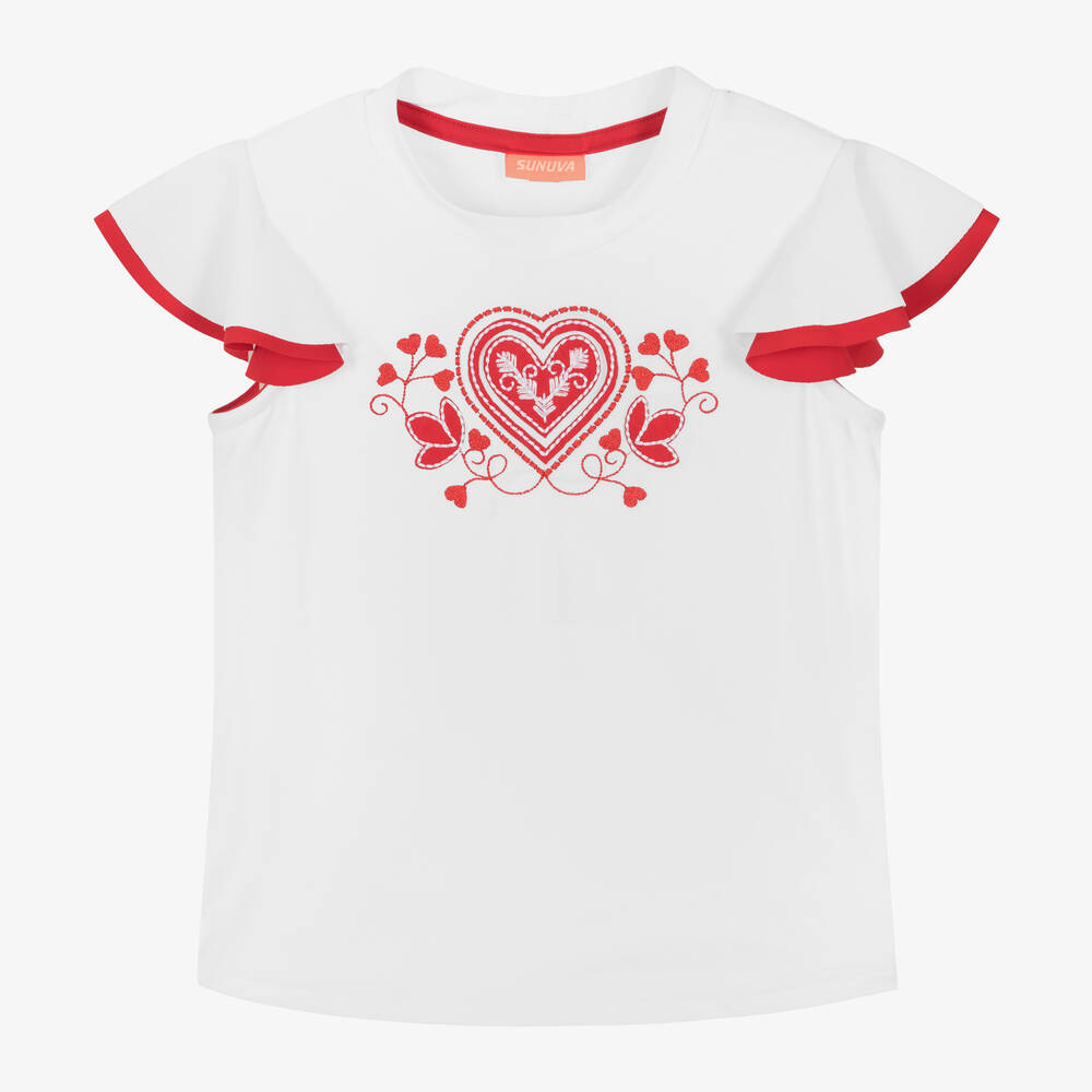 Sweet white swim top for girls by Sunuva, made using recycled materials. Featuring a bohemian-inspired red heart design on the chest, this silky, stretchy style has ruffles on the shoulders for a pretty look and a little extra coverage.