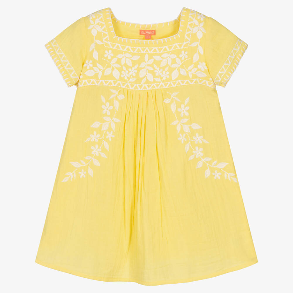 Beautiful yellow beach dress for girls by Sunuva, with white embroidered floral detailing. Soft and lightweight, this pull-on style is made in cotton cheesecloth with a squared neckline and pretty stitched trims. It is lovely and casual to wear as a beach cover-up or when out and about in warm weather.
