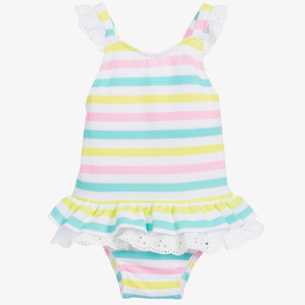 White swimsuit for baby girls with pink, yellow and green stripes, from Sunuva. Made from soft and stretchy fabric with a textured weave, it has UPF 50+ sun protection. Fully lined for comfort, it has pretty ruffles and broderie Anglaise trim, with a bow detail on the back.