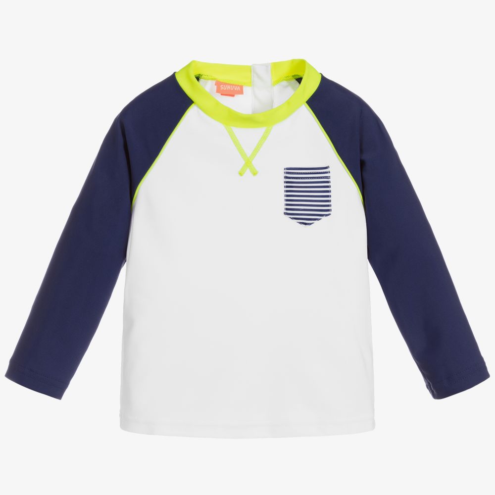 Baby boys white and navy blue sun protective top from Sunuva, with neon yellow trims. Made in a silky-soft fabric, with UPF 50+ protection validated by The British Skin Foundation.