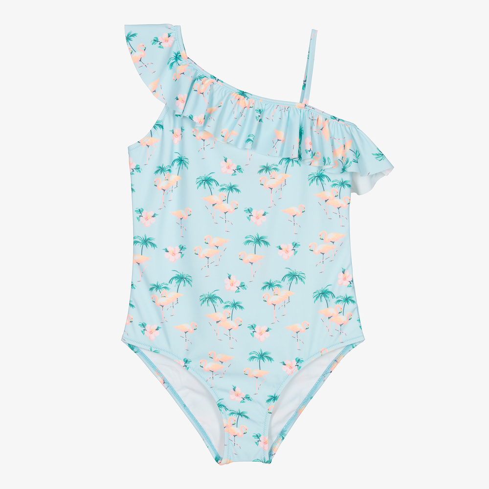 Teen girls lovely aqua blue swimsuit from Sunuva, with a tropical themed pink flamingo print. Silky smooth with a full lining for comfort, it has one shoulder and pretty ruffle trim.