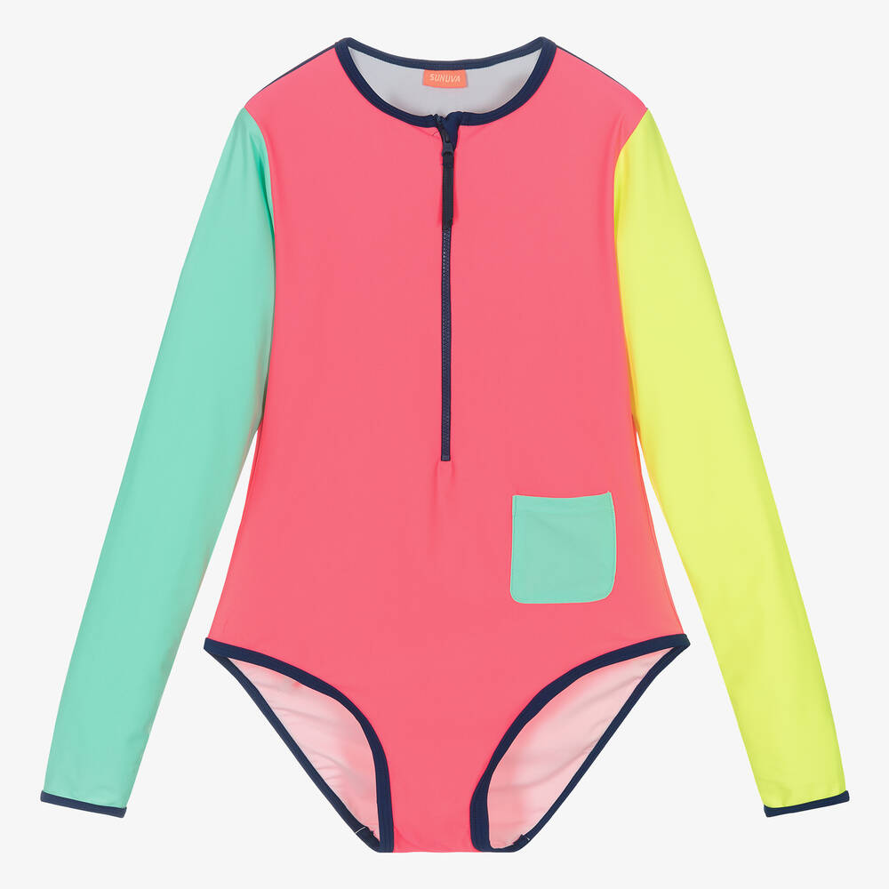 Teen girls neon pink swimsuit from Sunuva, in an eye-catching colourblock design. This long-sleeved all-in-one is lovely for keeping covered up in the sun, styled with a simple zip-up front and a patch pocket. It is fully lined in a breathable fabric and is finished with stretchy trims. This garment is made from recycled yarn.