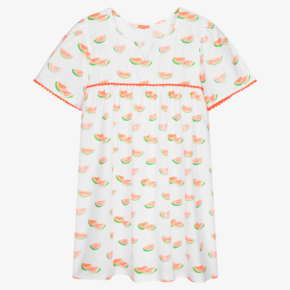 Teen girls white beach dress from British swimwear brand Sunuva, exclusive to Childrensalon. It is made in soft cotton voile, with a neon pink and green watermelon pattern. In a loose-fit style, it has coral pink pom-pom trims and gathers on the shoulder.