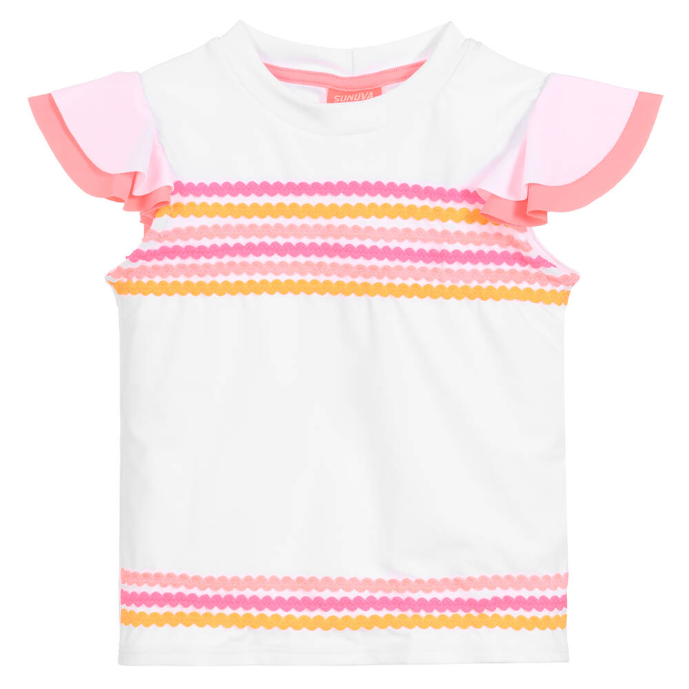 Girls white sun protective top from Sunuva, with neon pink and orange ric-rac decoration and white and pink flutter sleeves. It is made in a silky-soft fabric, with UPF 50+ sun protection.