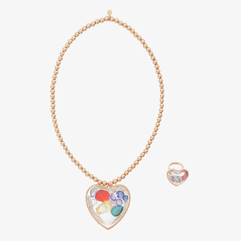 Eye-catching gold tone necklace and ring set for girls by fashion accessory brand Super Smalls. Both pieces have matching jewelled hearts filled with colourful gems that can move and shake for an added fun element. The beaded gold tone chain is stretchy with a logo charm on the back and the ring is adjustable for a good fit. Presented in a branded box, this duo accessory will add some sparkle and bold statement to any look.