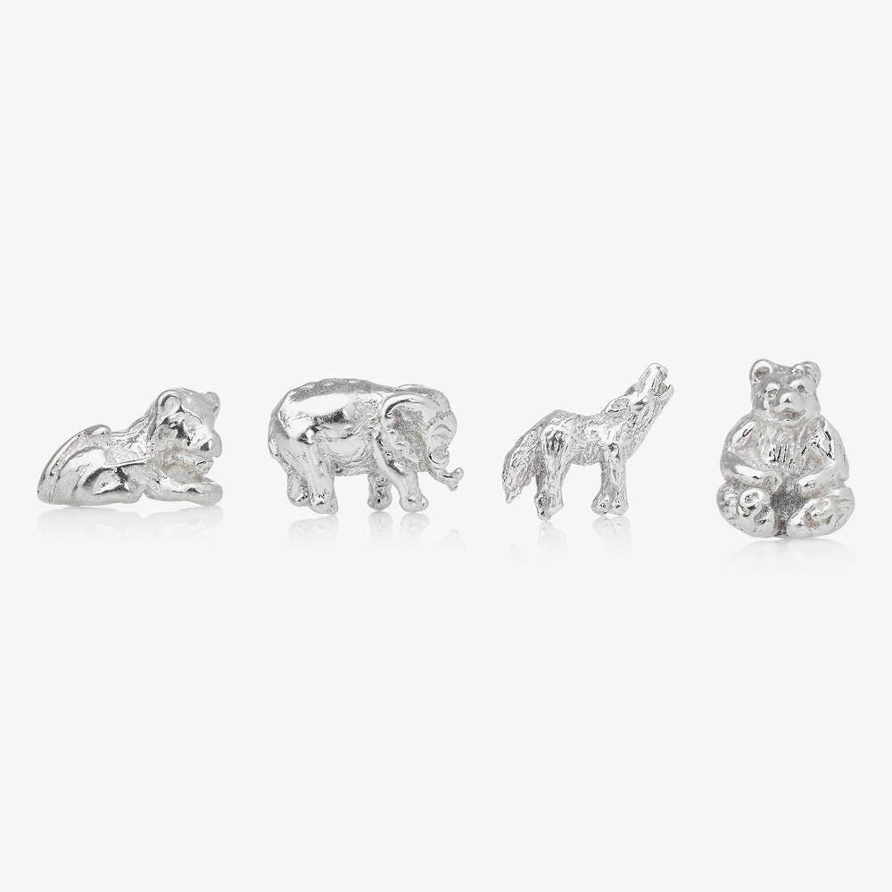 Sterling silver keepsake gift by Tales From The Earth, comprising four animal charms. The animals have special significance: the wolf represents close family and friends; the elephant represents long life; the lion represents courage, and the bear represents wisdom. The set is presented in a gift box and bag with a 'silver zoo' plate.