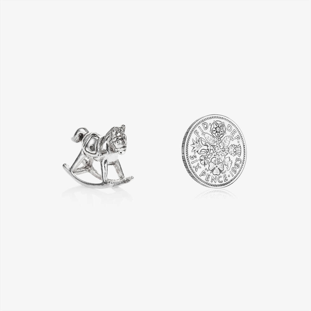 Sterling silver keepsake charms by Tales From The Earth. The charms hold special significance; the rocking horse and an old-fashioned sixpence coin represent childhood nostalgia. Ideal as a gift to commemorate a special event, the set is presented in a gift box and pouch with a thoughtful 'childhood' plaque.