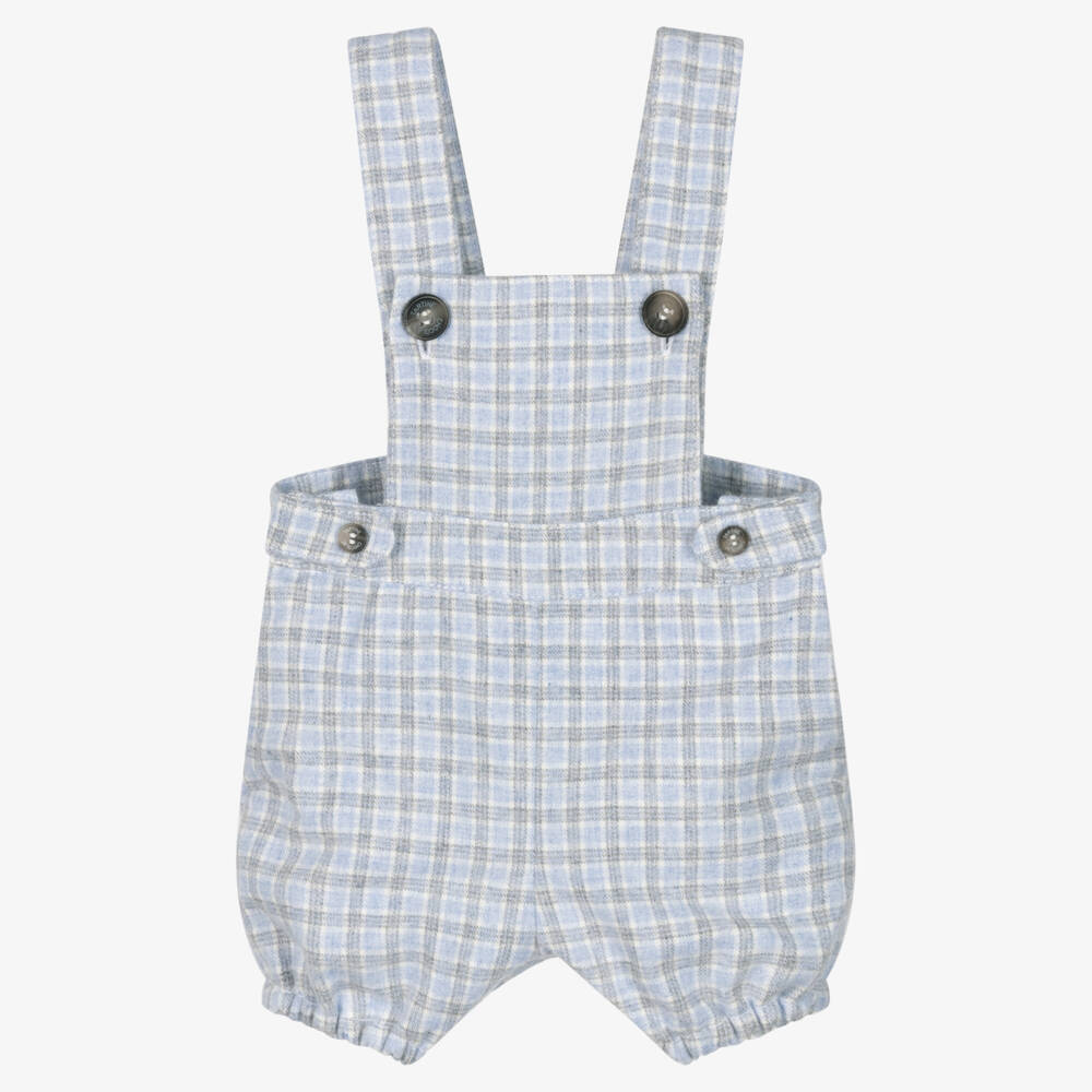 Blue and grey check dungaree shorts for baby boys by Tartine et Chocolate, made in soft brushed cotton with a comfortable jersey lining. For a classic look, this timeless style has a square bib front with adjustable button shoulder straps. Concealed popper fastenings on the waist and between the legs help with dressing and changing.