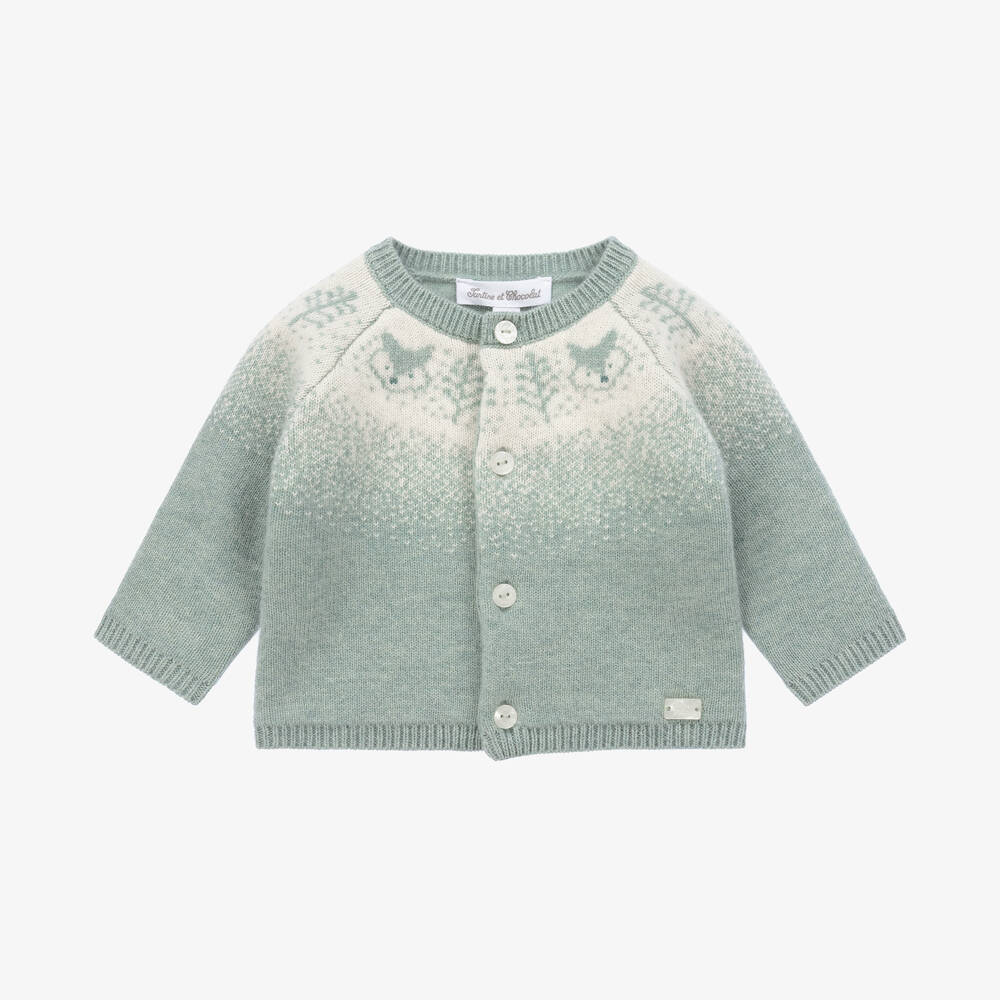 Gorgeous green cardigan for baby boys by French brand Tartine et Chocolat, knitted in a luxuriously soft wool and cashmere blend. Super soft and cosy, this lovely piece has an ivory and green Fair Isle design with cute foxes and trees. With long sleeves, button fastenings and ribbed trims, it is ideal for layering on colder days. There is a pearlised logo charm by the hem for a discreet designer finish.