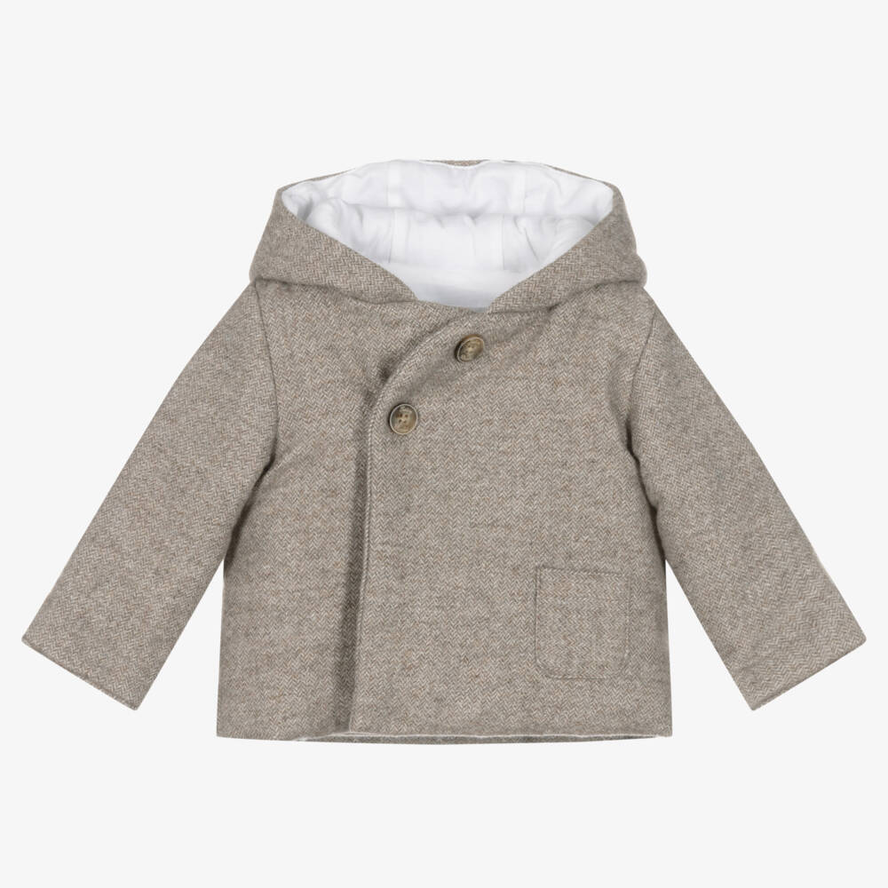 A cute hooded jacket for baby boys by French brand Tartine et Chocolat, woven in grey and brown herringbone. Made from soft cotton, this cosy layer has a single pocket on the front, along with concealed popper fastenings for easy dressing. It is warmly padded and has a soft jersey lining for maximum comfort.