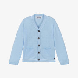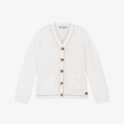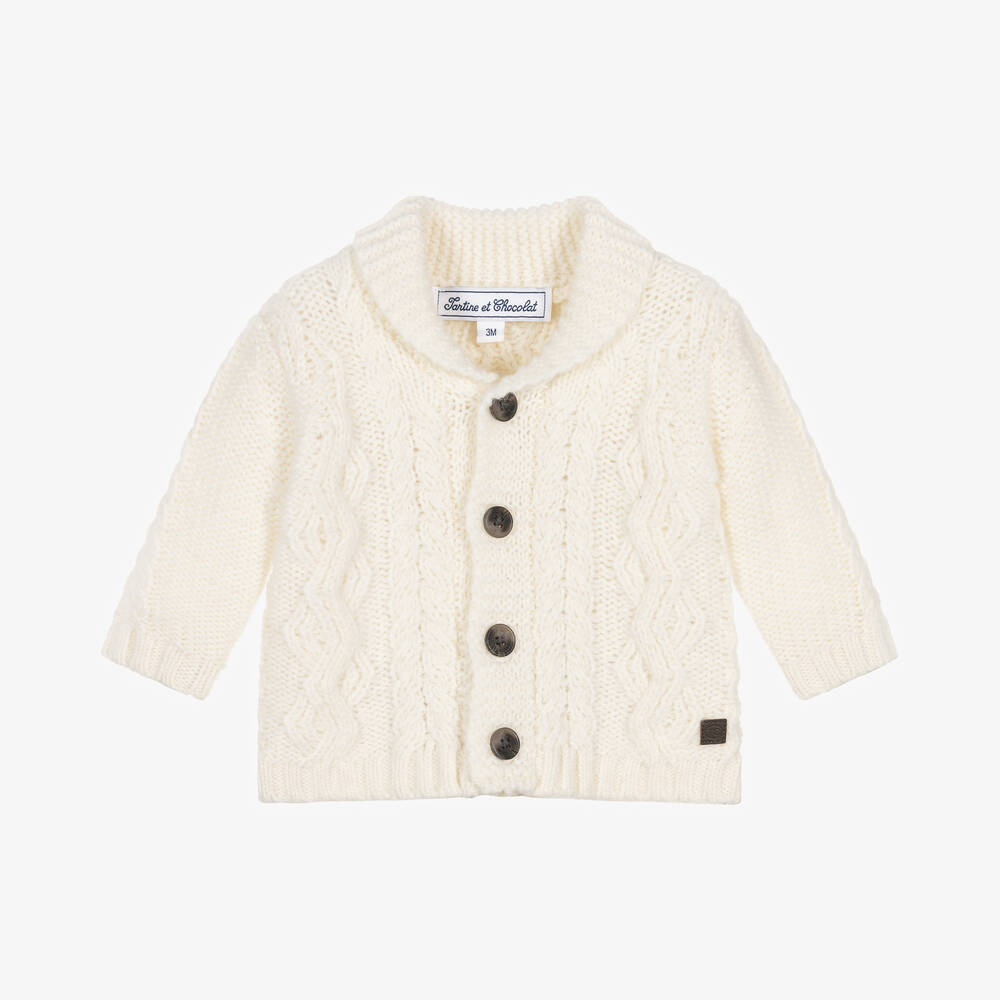 An ivory long-sleeved cardigan for baby boys by French brand, Tartine et Chocolat. Knitted in luxuriously soft wool, it has a classic shawl collar and beautiful cable knit detailing. There are branded button fastenings, with a small logo tab near the hem.