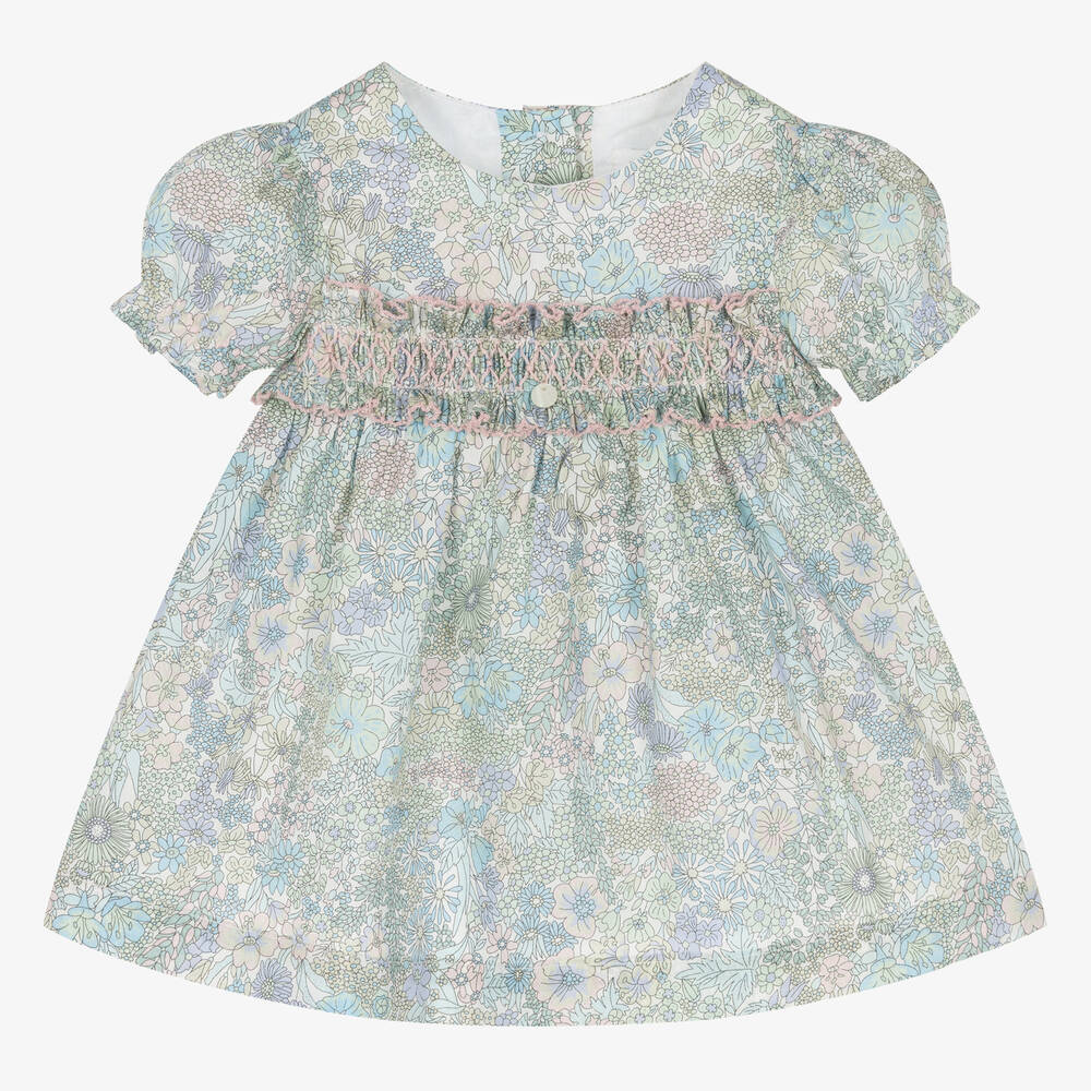 A cute floral dress for baby girls by Tartine et Chocolat, made in luxuriously soft and lightweight Tana Lawn™ cotton. Full of charm, the pastel Liberty print features lovely flowers in hues of blue, purple and green. Adding texture, the ruffled trim across the bodice is beautifully hand-smocked and trimmed with a delicate pink picot edge. It has short puff sleeves and full-length button fastenings on the back for a classic look.