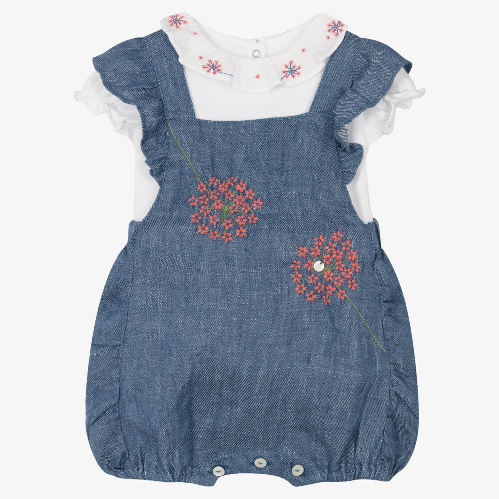 Cute white and blue dungarees set for baby girls from luxury brand Tartine et Chocolat. Made in soft and stretchy cotton jersey, the bodyvest has poppers on the back and between the legs for quick dressing and changes. The blue linen chambray dungarees fasten between the legs with buttons and have adjustable straps for a better fit. Both pieces are decorated with light ruffles and dainty embroidered flowers to bring the outfit together.