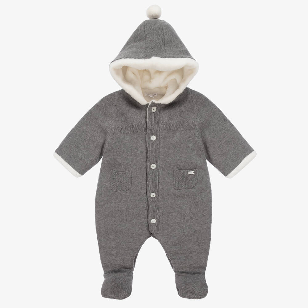 Cosy grey hooded pramsuit for baby boys and girls by classic French brand Tartine et Chocolat. Knitted in a soft cotton, wool and cashmere blend, it has sweet moss stitch detailing and front patch pockets, one with a logo charm. The hood has a super soft, white faux fur pom-pom on top, coordinating with the warm, faux fur lining. The pramsuit fastens with logo buttons on the front and easy-to-use poppers between the legs for speedy changes.