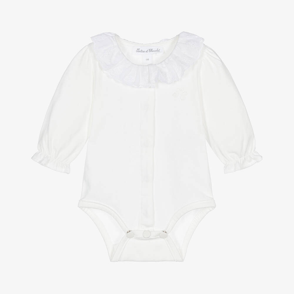 Beautiful ivory bodysuit for baby girls by French brand Tartine et Chocolat. Made in soft cotton jersey for gentle comfort against her skin, it has a ruffled voile collar with delicate floral embroidery. There is a tonal logo embroidery on the chest and the long sleeves have gently elasticated, frilled cuffs. There are popper fastenings on the front and between the legs for speedy dressing and nappy changes.