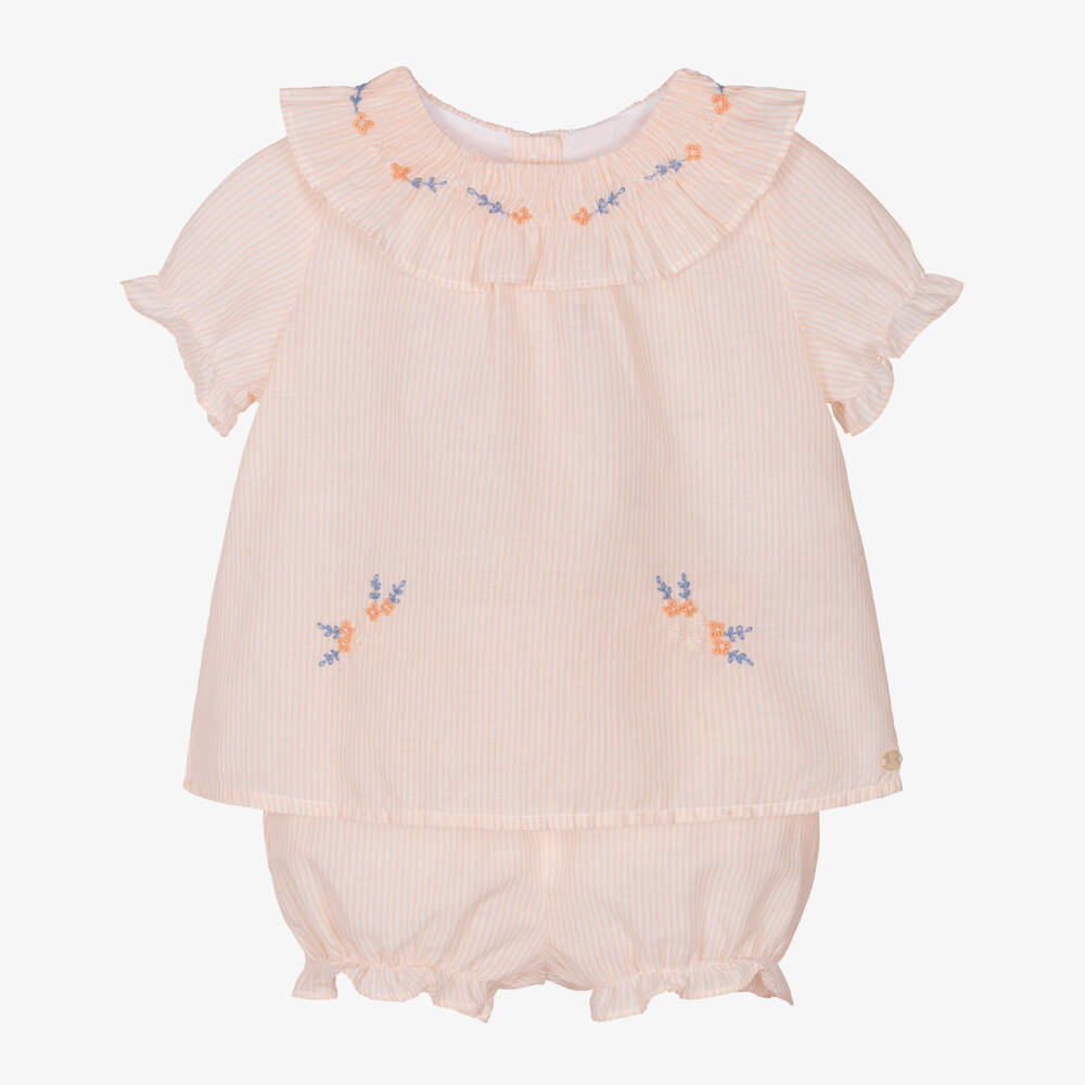 Pink and white shorts set for baby girls by Tartine et Chocolat, woven from soft and lightweight cotton. A striped design, the short-sleeved top has a ruffled collar with delicate orange and blue flowers embroidered around the neckline. These can also be seen on the front. The cuffs are lightly elasticated and there are branded button fastenings on the back. The matching shorts have an elasticated waistband and stretchy leg openings for comfortable wear.