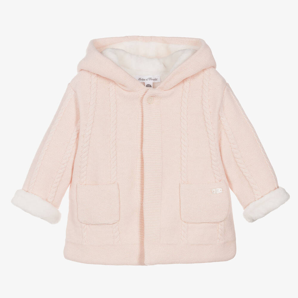 Cosy pink pram coat for baby girls by French brand Tartine et Chocolat. Knitted in a luxurious wool, cashmere and cotton blend, this sweet style has a fixed hood and a traditional cable knit design. It fastens with a logo button and concealed poppers on the front, and is fully lined in snuggly plush for warmth.