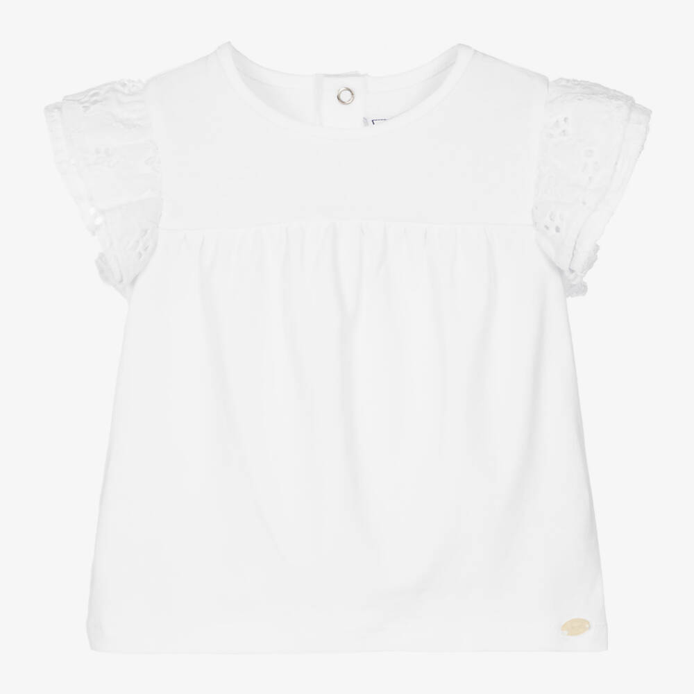 Super sweet and pretty, this white blouse for baby girls by Tartine et Chocolat is made from soft jersey. Ideal for a feminine look, it has gathered detailing across the chest and layered frill broderie anglaise short sleeves. Fastening with poppers on the back, it has a pearlescent logo tab on the hemline for a branded finish.