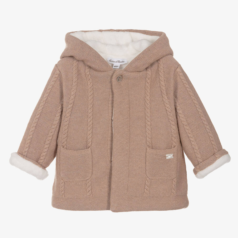 Cosy beige pram coat for baby boys and girls by French brand Tartine et Chocolat. Knitted in a luxurious wool, cashmere and cotton blend, this sweet style has a fixed hood and a traditional cable knit design. It fastens with a logo button and concealed poppers on the front, and is fully lined in snuggly plush for warmth.